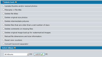 På administratörsverktygens första panel så kan du välja vilket verktyg du vill använda och vilket album de ska användas för. Efter du skickat formuläret körs det aktuella verktyget.