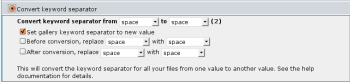 Det här kommer att byta ut nyckelordsavgränsare i alla dina filer från ett värde till ett annat. Du bör också kontrollera "Sätt nyckelord för galleri till ett nytt värde" så att galleriet fungerar korrekt efter nyckelordsavgränsaren bytts ut. Före bytet så kan du ersätta ditt snart-nya-avgränsare mot ett annat tecken så att dina nuvarande nyckelord bevaras intakta. Du kan också ersätta ett tecken efter ändringen. Detta är användbart om du använde understrykningstecken i Coppermine 1.4 och tidigare och du vill byta ut dessa mot blanktecken efter du bytt ut din avgränsare mot semikolon. Exempel: Före bytet, "South Dakota;mountain" har 2 nyckelord med semikolon som avgränsare. Om du byter ut semikolon mot blanktecken kommer resultatet att bli "South Dakota mountain" som har 3 nyckelord. Om du byter ut blanktecken mot understrykningstecken först, så får du resultatet "South_Dakota mountain" som behåller dina två nyckelord intakta.